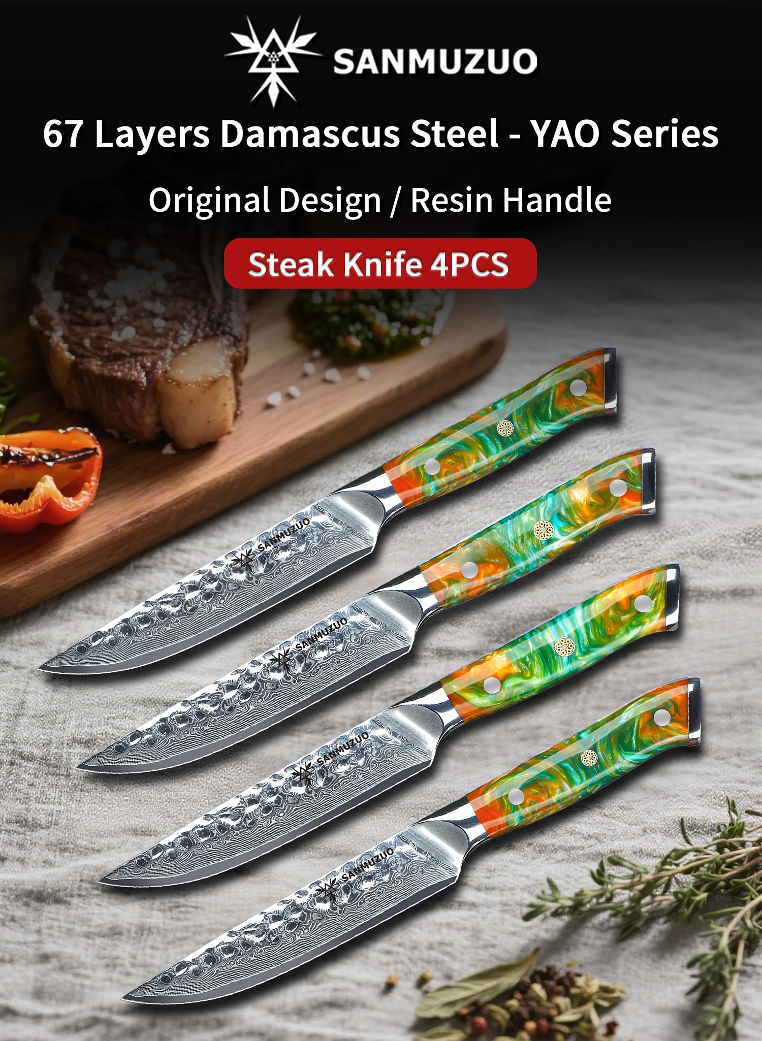 5″ SANMUZUO 4-Piece Steak Knife Set – YAO Series – Damascus Steel Blades – Resin Handle